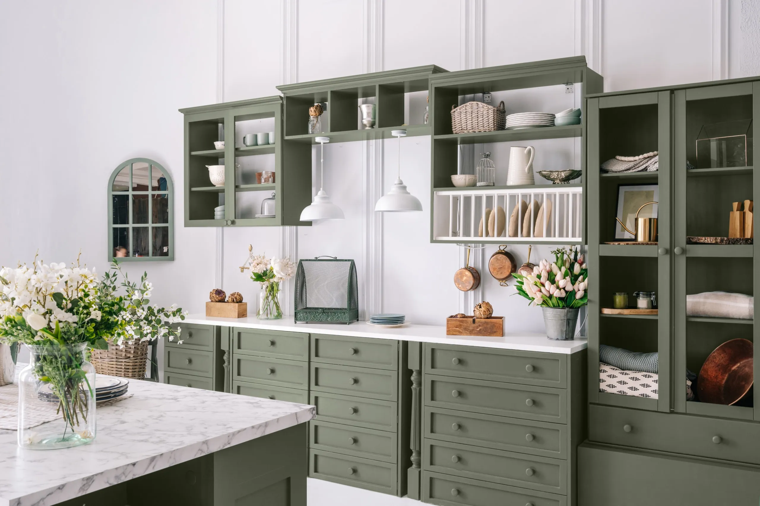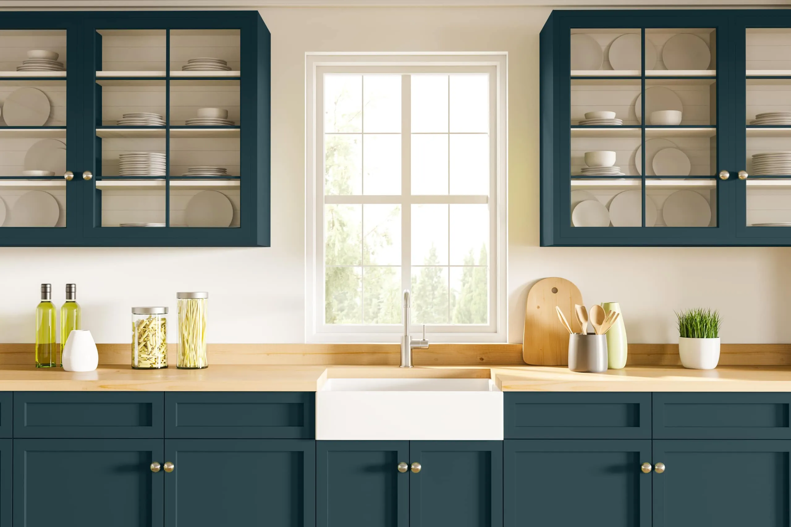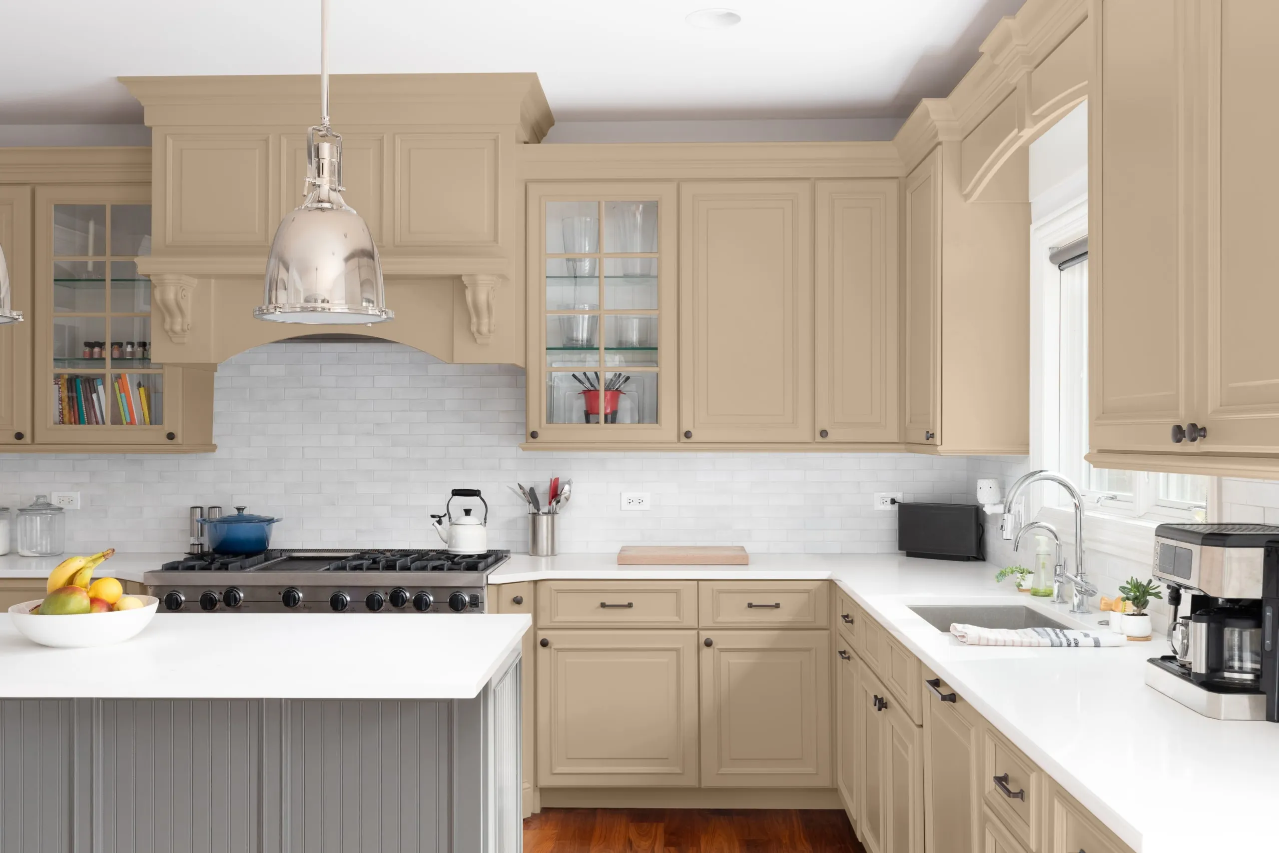 This depends on the look you want to achieve. For a classic, airy feel, try lighter cabinets, such as Milk Glass (DEW358), paired with walls in soft neutrals like Stonish Beige (DEC716). For a modern, grounded look, use deep cabinet hues with lighter walls for bold contrast.