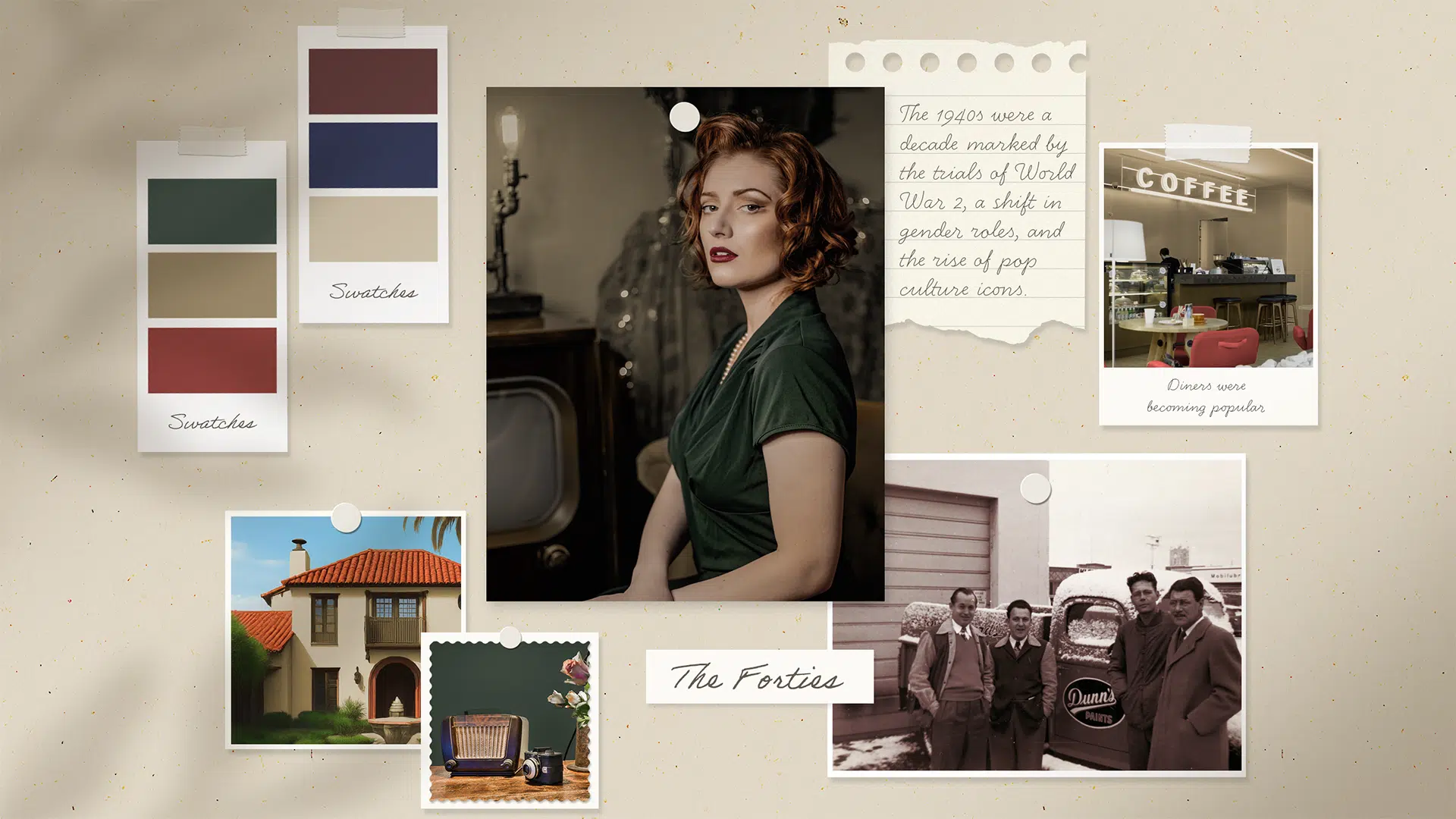 The 1940s were characterized by muted colors, streamlined furniture silhouettes, and materials that reflected the resourcefulness of the era. The rich jewel tones in this color palette, paired with dark wood stains and sleek metal accents, embody a message of enduring strength during a difficult decade. Interior design of the time incorporated floral prints, often featuring mid-tone neutral colors, to soften the look of practicality in furnishings.