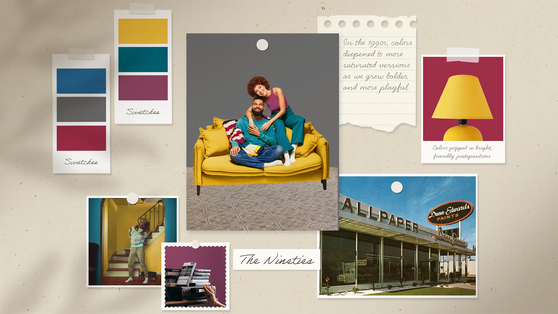 The 1990s were a time of transition, leaning away from the bright colors of the previous decade and towards a darker, more saturated aesthetic. Homes took on a more eclectic vibe, and deep colors like teal and plum made great backdrops for displaying collected objects. This color palette, paired with warm wood tones and varied textures, reminds us of a time of hanging out with friends and listening to our favorite grunge band.