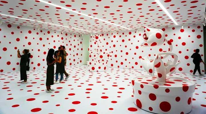 Kusama’s exuberant sculptural installation "With All My Love For The Tulips, I Pray Forever" (2011) exemplifies the dualism found throughout her work between the organic and the artificial. Shown here for the first time in Los Angeles, the over-sized flower-potted tulips made from fiberglass-reinforced plastic are painted with the same red polka dots as the floor, ceiling and walls, creating an immersive viewing experience while at the same time diminishing the appearance of depth. This work exemplifies Kusama’s singular vision and her distinctive gift for drawing viewers into the work on a deeply visceral level.