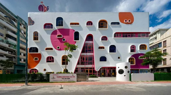 This trend is well represented in TTC Elite Saigon Kindergarten, by Kientruc O architects, with its whimsical facade decorated with colorful patterns and irregularly shaped windows. Located in Ho Chi Minh City, the kindergarten is meant to be a full-sized playhouse for children, provoking a sense of curiosity for the kids as they interact with it on a daily basis.