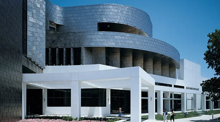 In the city of Cerritos, CA, sits a beautiful, modern building painted in Dunn-Edwards Swiss Coffee (DEW341) and capped with titanium cladding. Set alongside the Cerritos College buildings, the library makes a grand impression among the city’s other buildings.